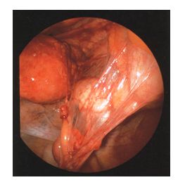 | 右の写真は、実際に腹腔鏡で腹腔内を観察したものです。 子宮と卵管、卵巣、そして腸管との間に膜状の癒着が起こっているのがはっきりとわかります。 このような癒着は子宮内膜症、子宮付属器炎(クラミジア、淋病、大腸菌や結核菌などが原因となって起こる卵管や卵巣などでの炎症性疾患)などでよく見られるものです。 超音波や内診では、なかなかこのような癒着を発見することはできないもので、腹腔鏡を行ってみて初めてわかるものと言っても良いでしょう。 |