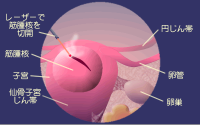 腹腔鏡下筋腫核出術(LAM) これは腹腔鏡下で筋腫核の核出術(筋腫のコブだけを摘出する手術)です。 |